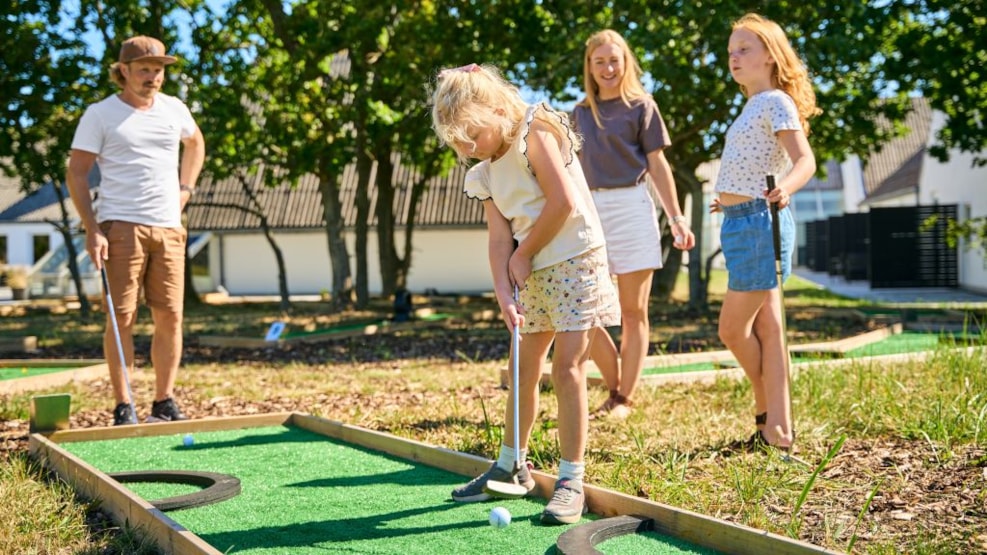 Nehmen Sie Ihre Familie oder Freunde mit zu einer gemütlichen Partie Minigolf im Hotel Hvide Klit in Ålbæk. Der charmante Platz bietet unterhaltsame Herausforderungen in einer wunderschönen Naturlandschaft – perfekt für eine entspannte Auszeit voller Spaß, Wettkampf und Urlaubsstimmung für Kinder und Erwachsene.